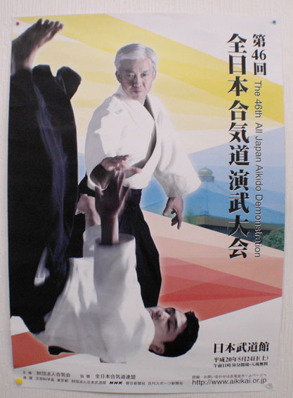 5月の第4土曜日は、日本武道館で毎年全日本合気道演武大会が行われる。これは合気会最大の行事である。今年で46回目。半世紀という時代の重さ、年々参加者も増え続ける。外国からもやってくる。この日本武道館で演武会が開催されることになった年、昭和51年、第15回大会から、わが青葉塾道場は出場している。その前の年、第14回大会が日比谷公会堂であったので、道場全員で見に行った。「いつかうちも出ような」と公会堂の入り口前の大会の看板に並んで写真を撮った。それが、何と、実現してしまったのである。私自身は、第9回(昭和46年)に出ている。ここが、あの社会党委員長・浅沼稲次郎襲撃の現場だ、と感慨を強くした記憶がある。その事件は1960年(昭和35年)のことだった、17歳の少年・山口二矢に、日比谷公会堂での演説中腹部を刺され、その傷がもとで絶命。私も、ちょうど17歳だった。その歴史的なところに今いるんだ、と壇上の畳の上でそう思った。15回大会から日本武道館でやることになったと聞いていたが、こちらは道場を作ってまだ3年目。その年、4月2日、3周年記念演武会を、青葉台小学校の体育館で開いた。そのあと本部の藤田昌武師範から連絡があり、出場が決まった。あまり時間がないが、日本中が注目しているんだ、よしっ!と意気込んだ。演武の内容は工夫して作り上げた。ま、恥ずかしくないものだった。当時は畳15枚の日本一狭い道場だった。ここでの稽古だけだった。さー、晴れて日本武道館。入場してみると、圧倒的に広かった。こんなに広いものか。畳の数も多い。私も含めて、出場者全員あわててしまった。稽古の習性は恐ろしいもので、15枚から外に出ない。畳の端のほうでもそもそやっているうち、終了の太鼓が鳴った。これではイカン、と翌年は、秋ぐらいから演武会の準備を始めた。その甲斐あって、2年目、何とかうまくいった。それを赤裸々に記録し、合気道新聞に投稿した。これは結構反響があり、青葉塾道場も知られるようになった。